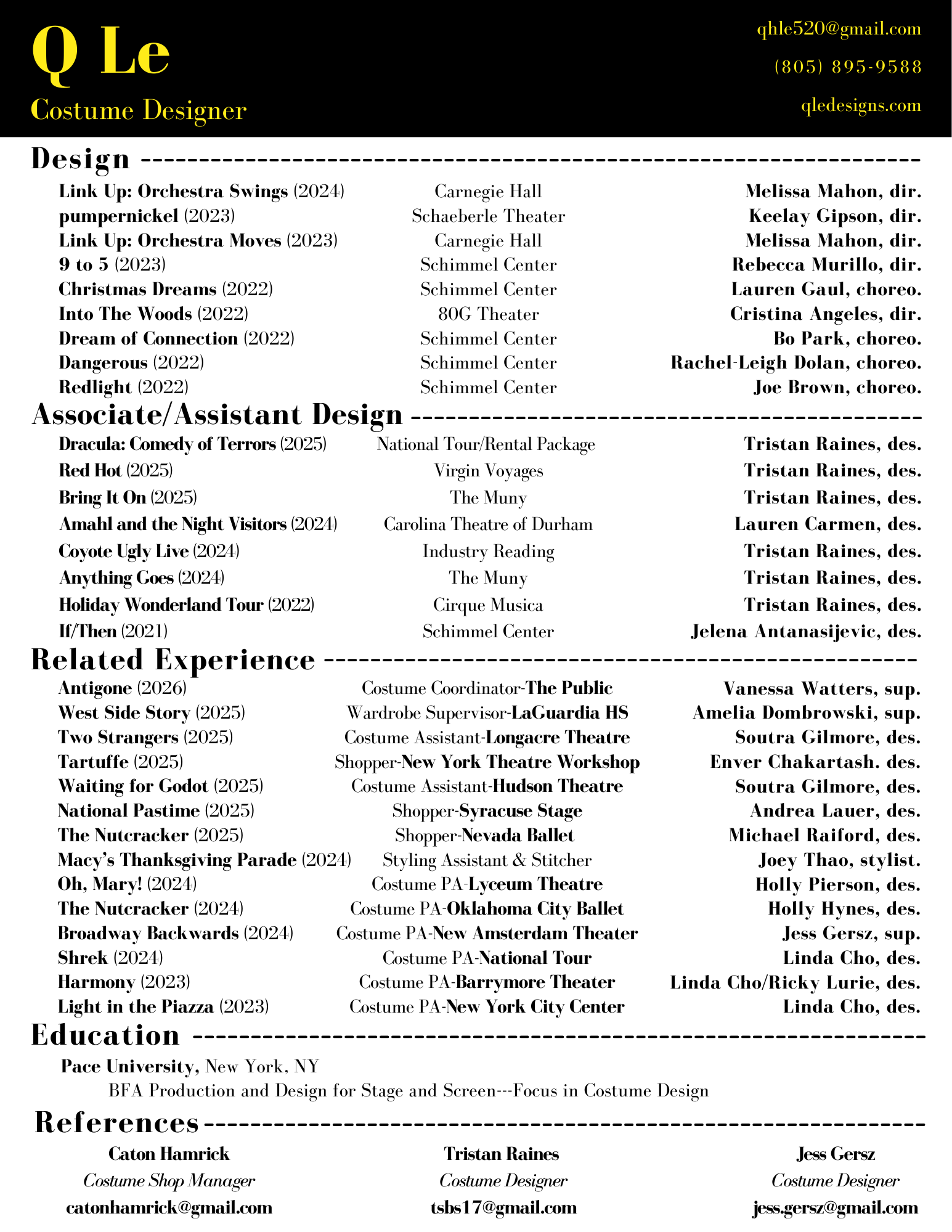 Originally from Santa Barbara, California, I recently graduated from Pace University in NYC with a degree in Production and Design with a concentration in costume design. I enjoy creating garments that play with color, texture, sparkle, and shine!
